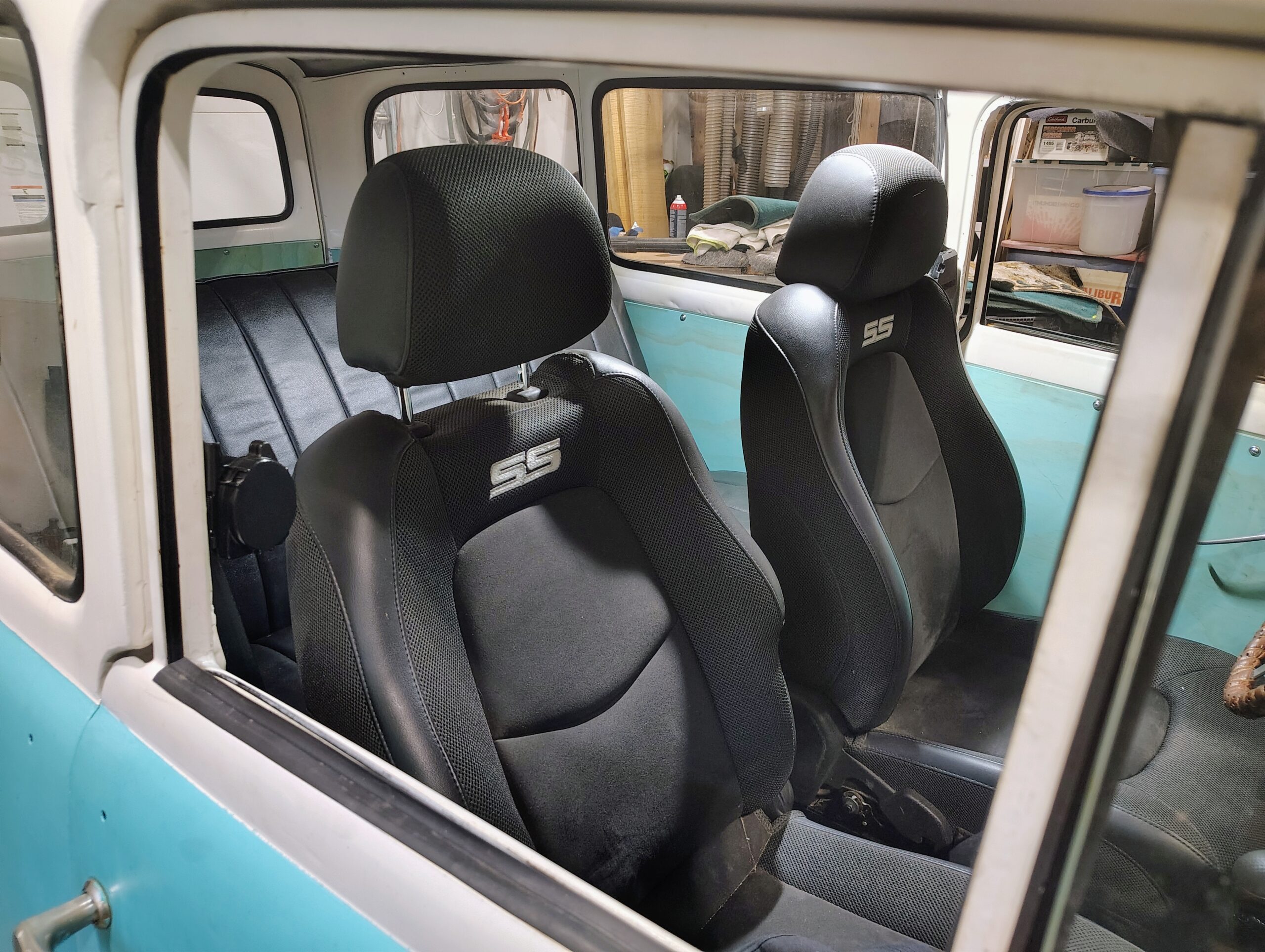 Windows (except rear door) are in, new felts on roll up windows, new gaskets all around on doors, heater wired and plumbed in, 12 to 6 volt setup for heater fan and windshield wipers – made the wipers 2 speed, grill on, new headlights, parking lights, tail lights are in. Passenger seat belt installed.